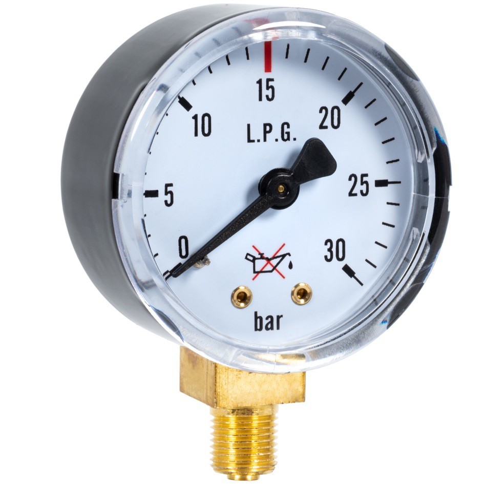 Liniowe odkształcenie sprężyny jest zamieniane na ruch obrotowy wskazówki określającej wartość mierzonego ciśnienia na wyskalowanej tarczy. Stosowany w reduktorze do odczytywania ciśnienia roboczego gazów typu : PROPAN - BUTAN