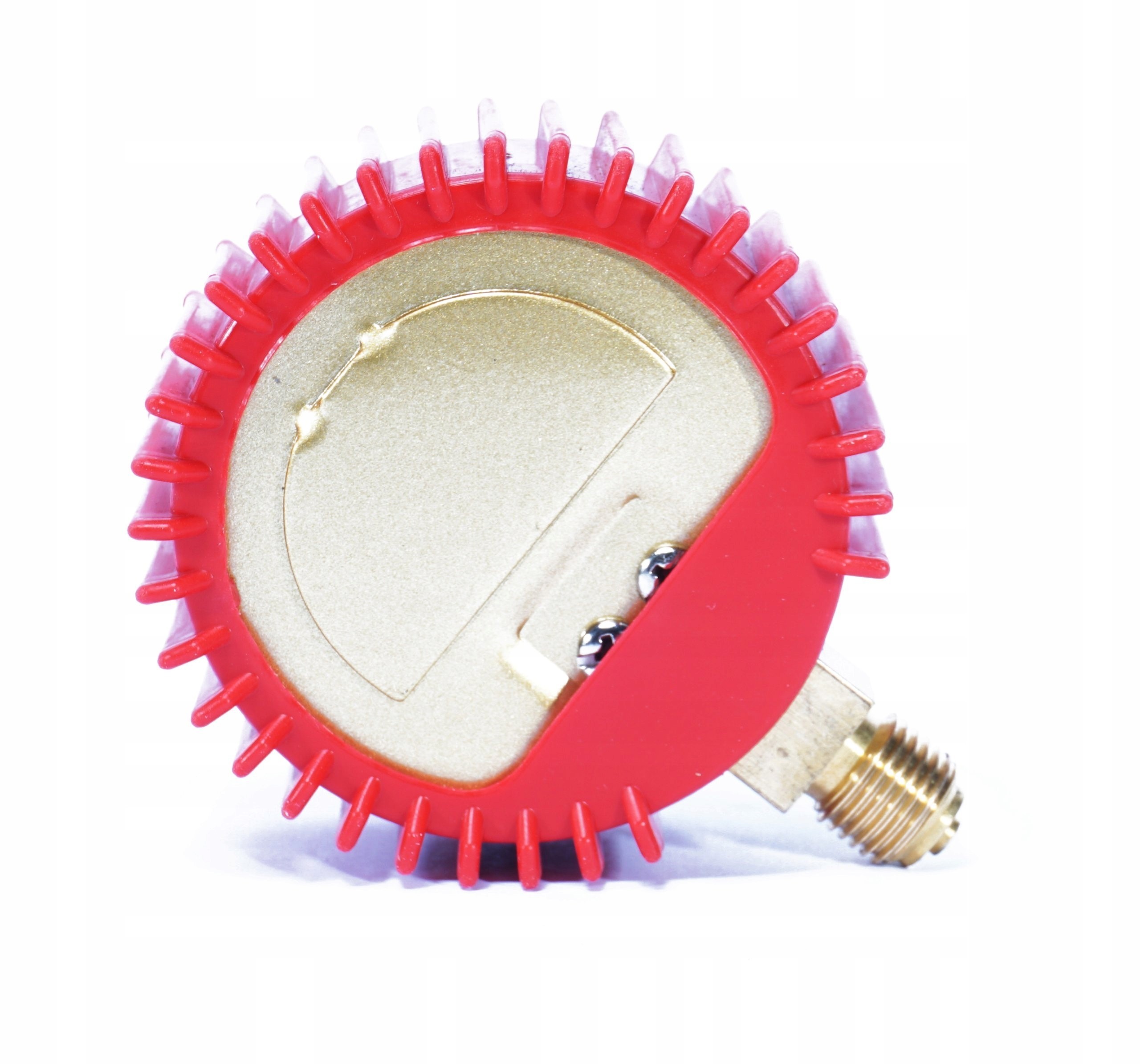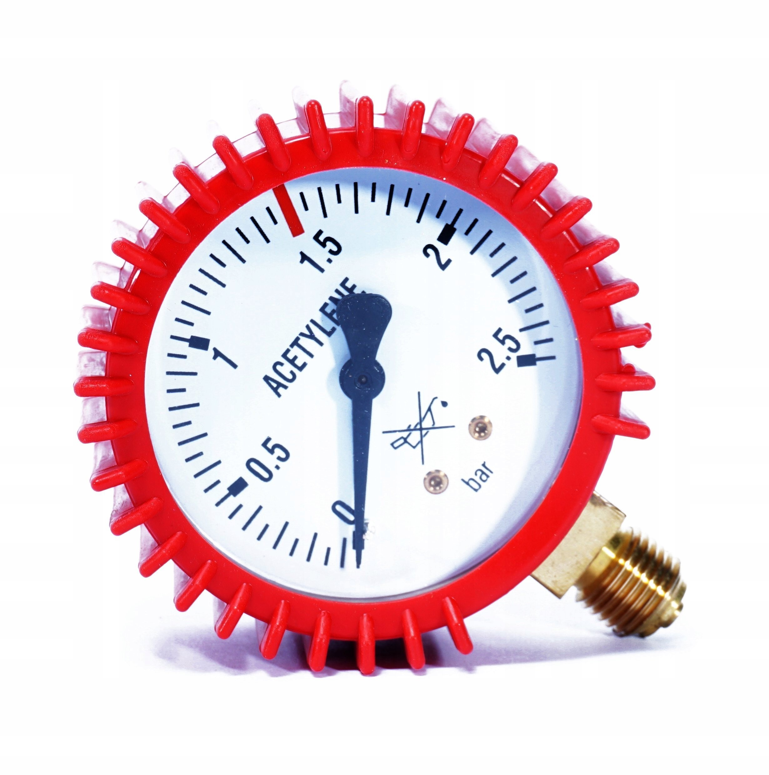 Manometr zegarowy do reduktorów butlowych spawalniczych z osłoną gumową.