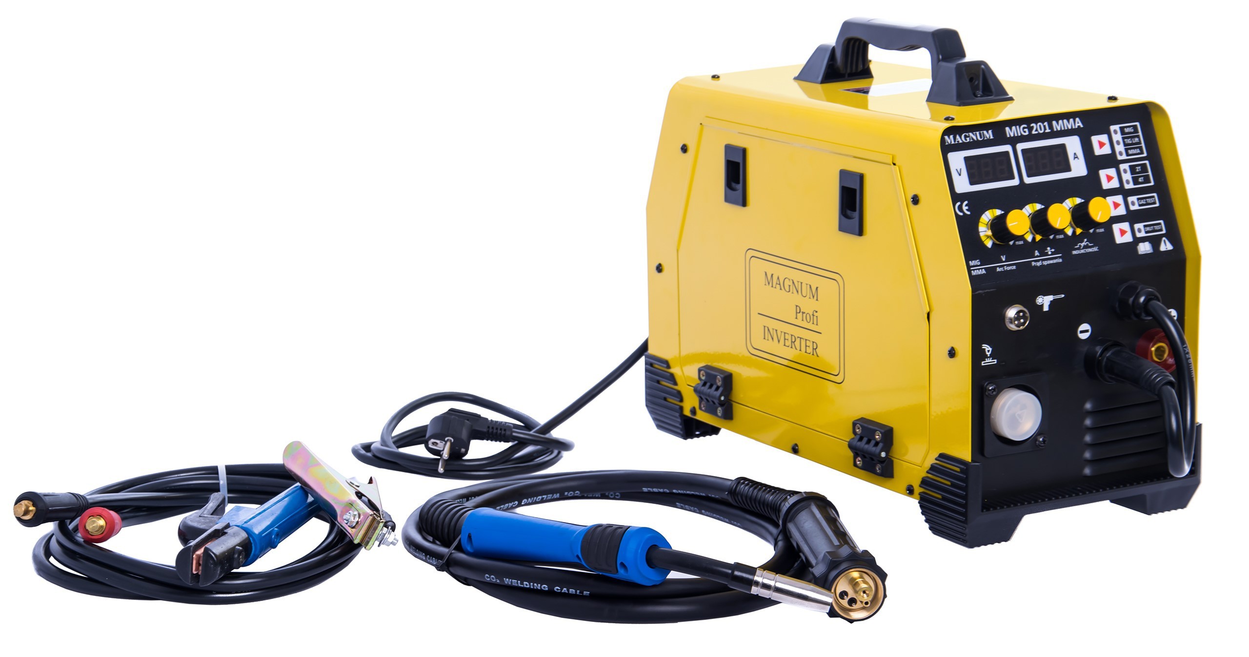 Urządzenie MAGNUM MIG201 MMA jest przenośnym półautomatem spawalniczym przeznaczonym do ręcznego, elektrycznego spawania stali niskowęglowej, niskostopowej (MAG), stali stopowych (MIG) oraz aluminium i jego stopów.