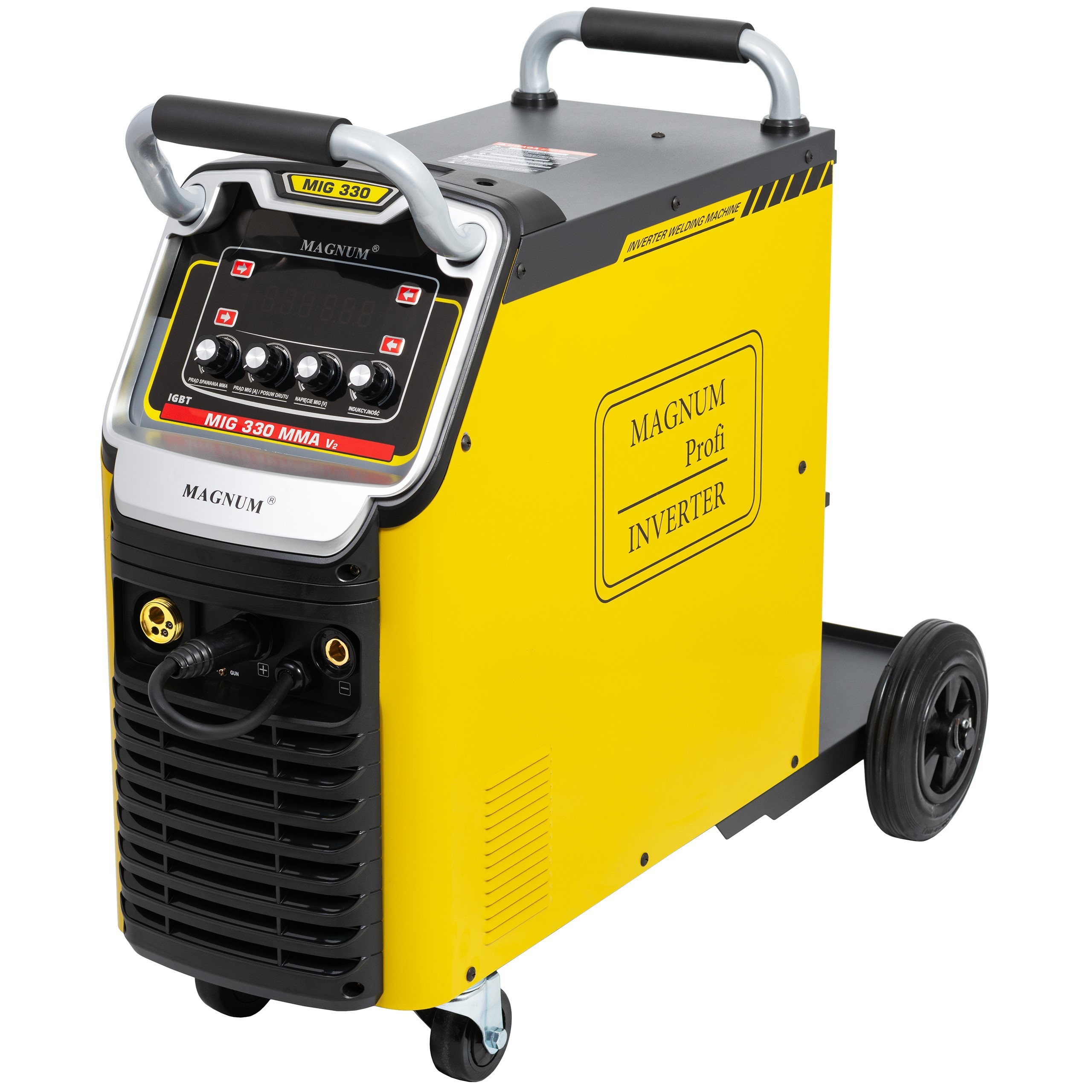 Urządzenie Magnum MIG 330 MMA IGBT V2 jest profesjonalnym półautomatem spawalniczym przeznaczonym do ręcznego, elektrycznego spawania stali niskowęglowej, niskostopowej (MAG), stali stopowych (MIG) oraz aluminium i jego stopów. Urządzeniem można również spawać metodą MMA, z wykorzystaniem topliwych elektrod otulonych.