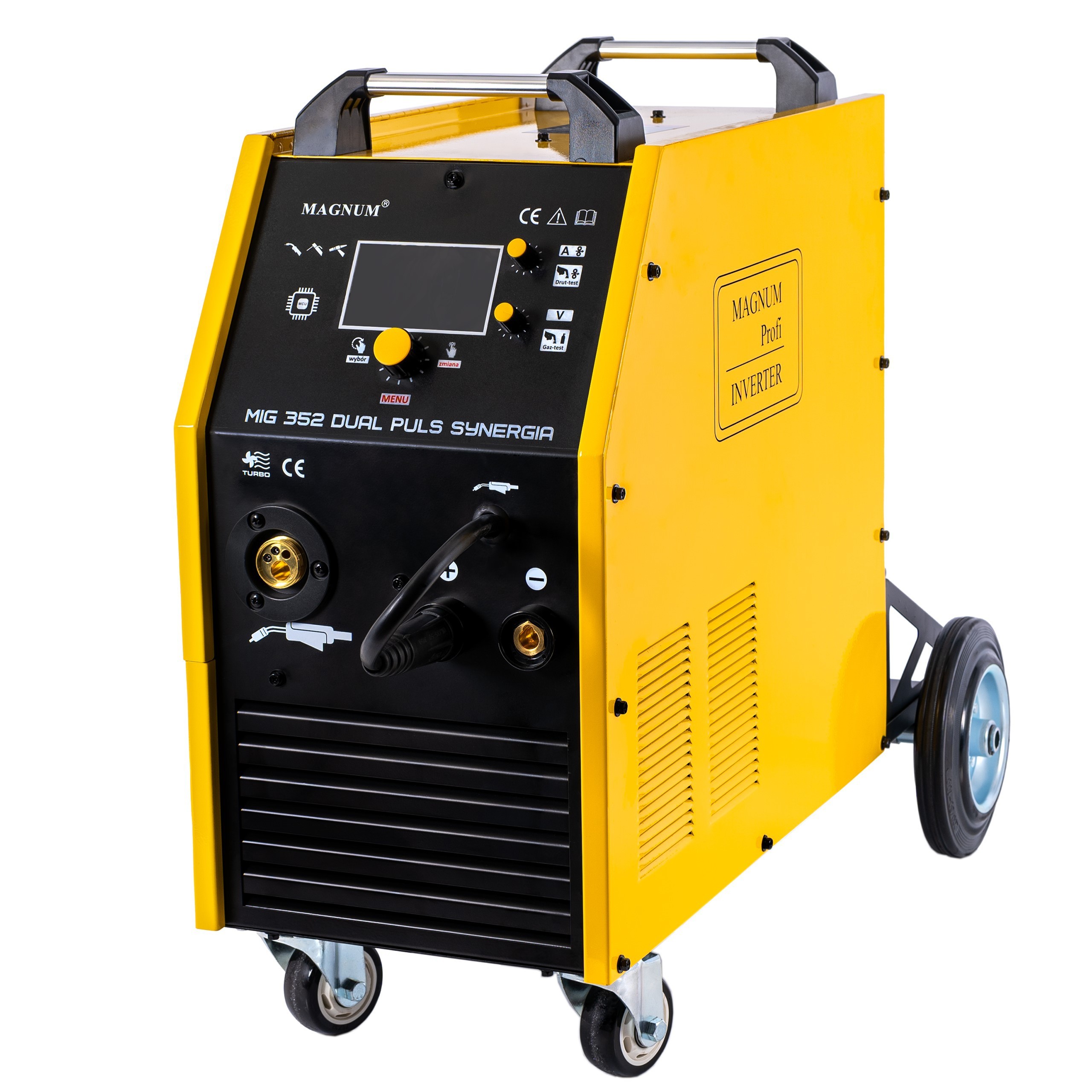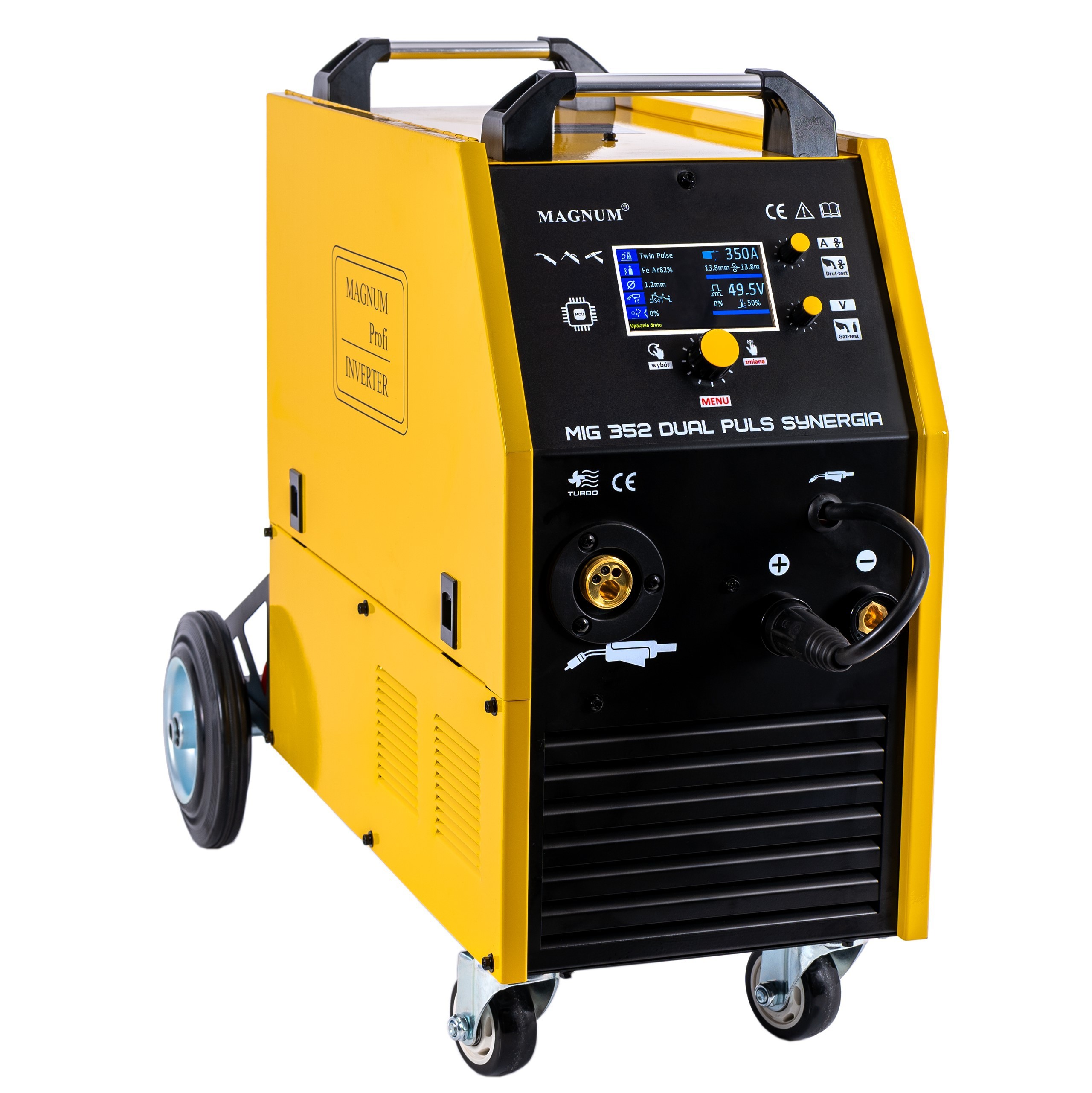 Spawarka Magnum MIG 352 Dual Puls Synergia to nowoczesne urządzenie spawalnicze, przeznaczone do ręcznego, elektrycznego spawania metodą MIG/MAG, MMA, TIG Lift, FCAW oraz Lutospawania. Urządzeniem można spawać wszelkie spawalne metale i ich stopy, między innymi takie jak: stale czarne, stale nierdzewne, aluminium i jego stopy, miedź i jej stopy itp.