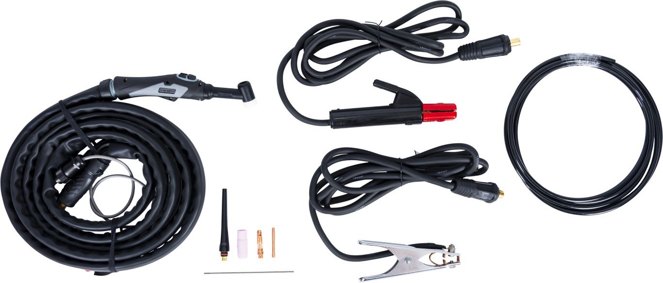 W zestawie znajduje się uchwyt TIG typu SR 26/4m chłodzony gazem z regulacją prądu spawania w rękojeści. Jego ergonomiczna konstrukcja oraz elastyczne przewody podnoszą komfort pracy spawacza.