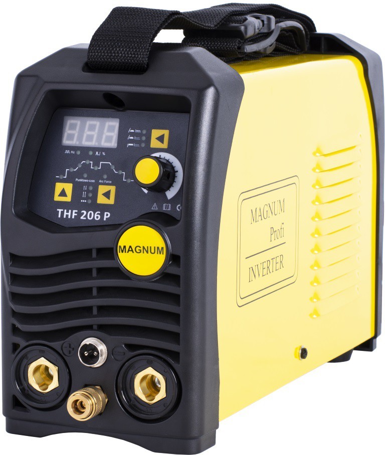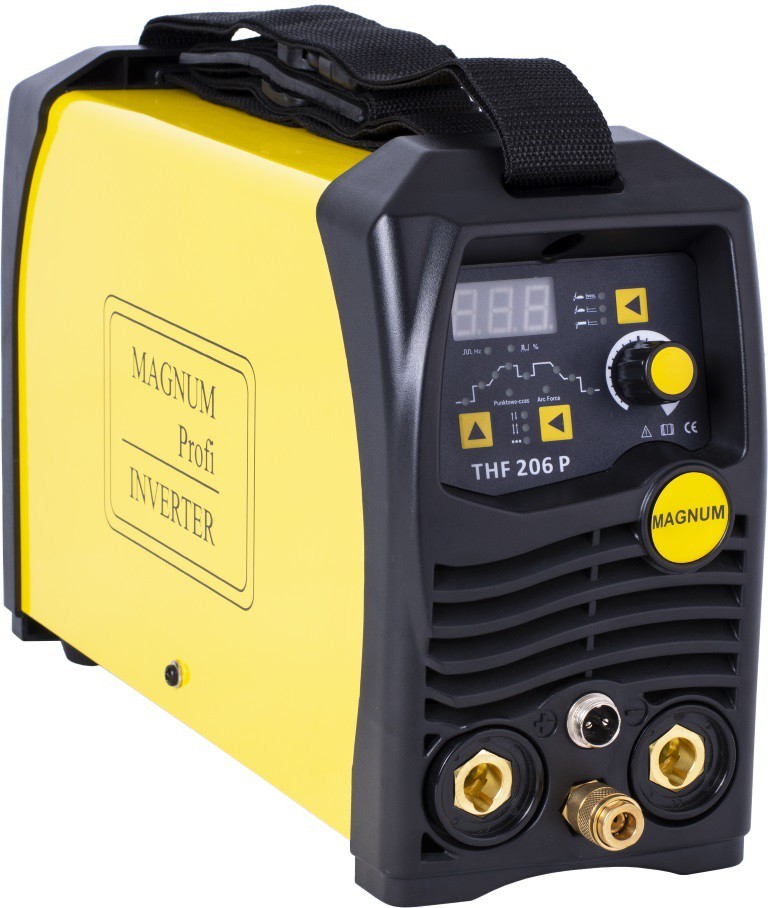Urządzenie THF 206P marki MAGNUM jest lekką, przenośną spawarką inwertorową przeznaczoną do spawania metodą TIG HF (z bezstykowym zajarzaniem łuku spawalniczego) prądem stałym DC. zapewnia doskonałą wydajność w spawaniu stali niestopowej, niskostopowej, wysokostopowej, tytanu oraz innych spawalnych metali i stopów. Urządzeniem można również spawać metodą MMA z wykorzystaniem topliwych elektrod otulonych.