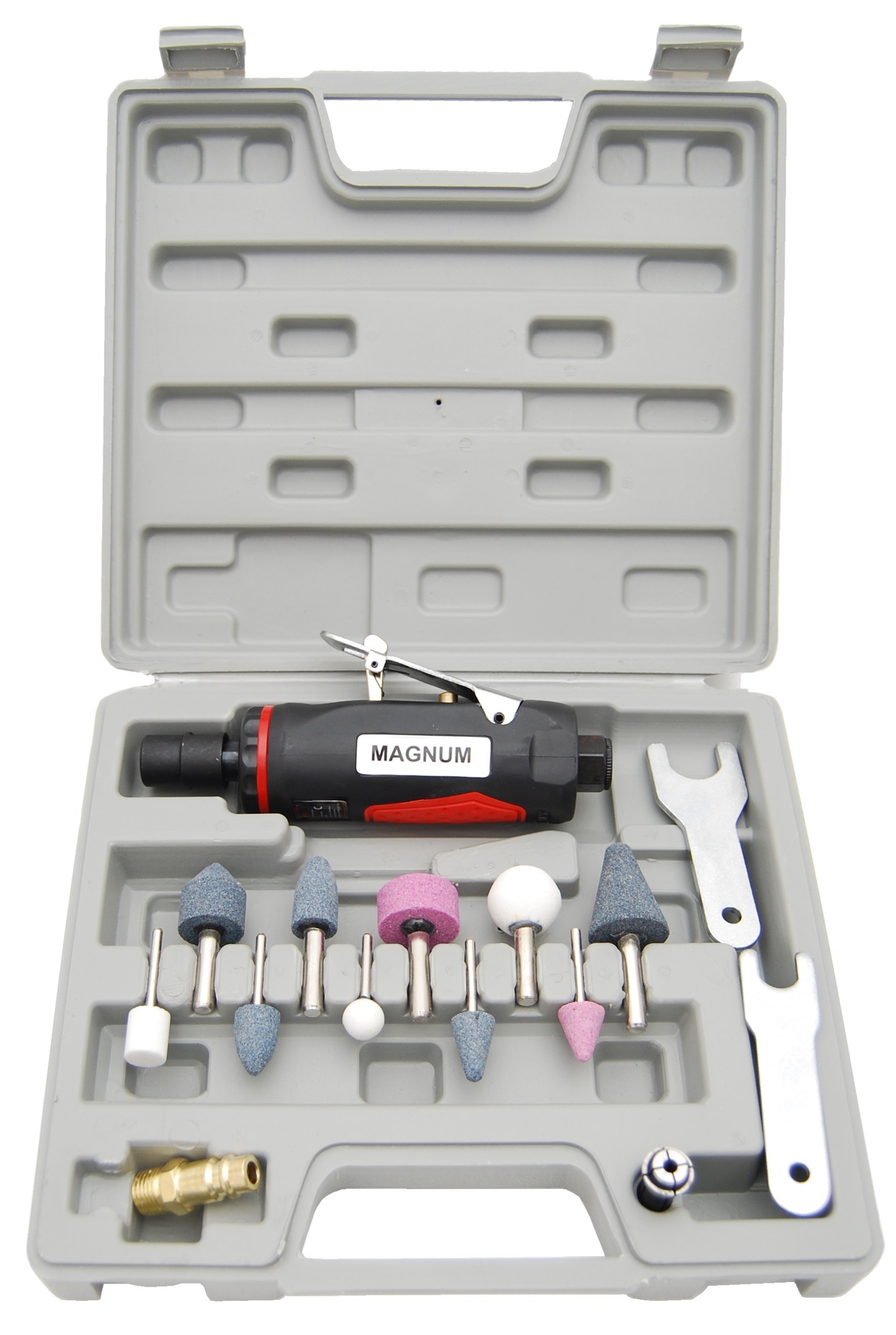 Pneumatyczna szlifierka trzpieniowa marki MAGNUM. Niezastąpione narzędzie dla każdego spawacza, ślusarza, mechanika czy serwisanta. Może współpracować z kamieniami i frezami palcowymi (pilnikami) o średnicy 3 i 6 mm. Lekka i ergonomiczne wyprofilowana. Spust wyposażony w blokadę zabezpieczającą przed przypadkowym uruchomieniem. Wylot powietrza umieszczony z tyłu urządzenia.