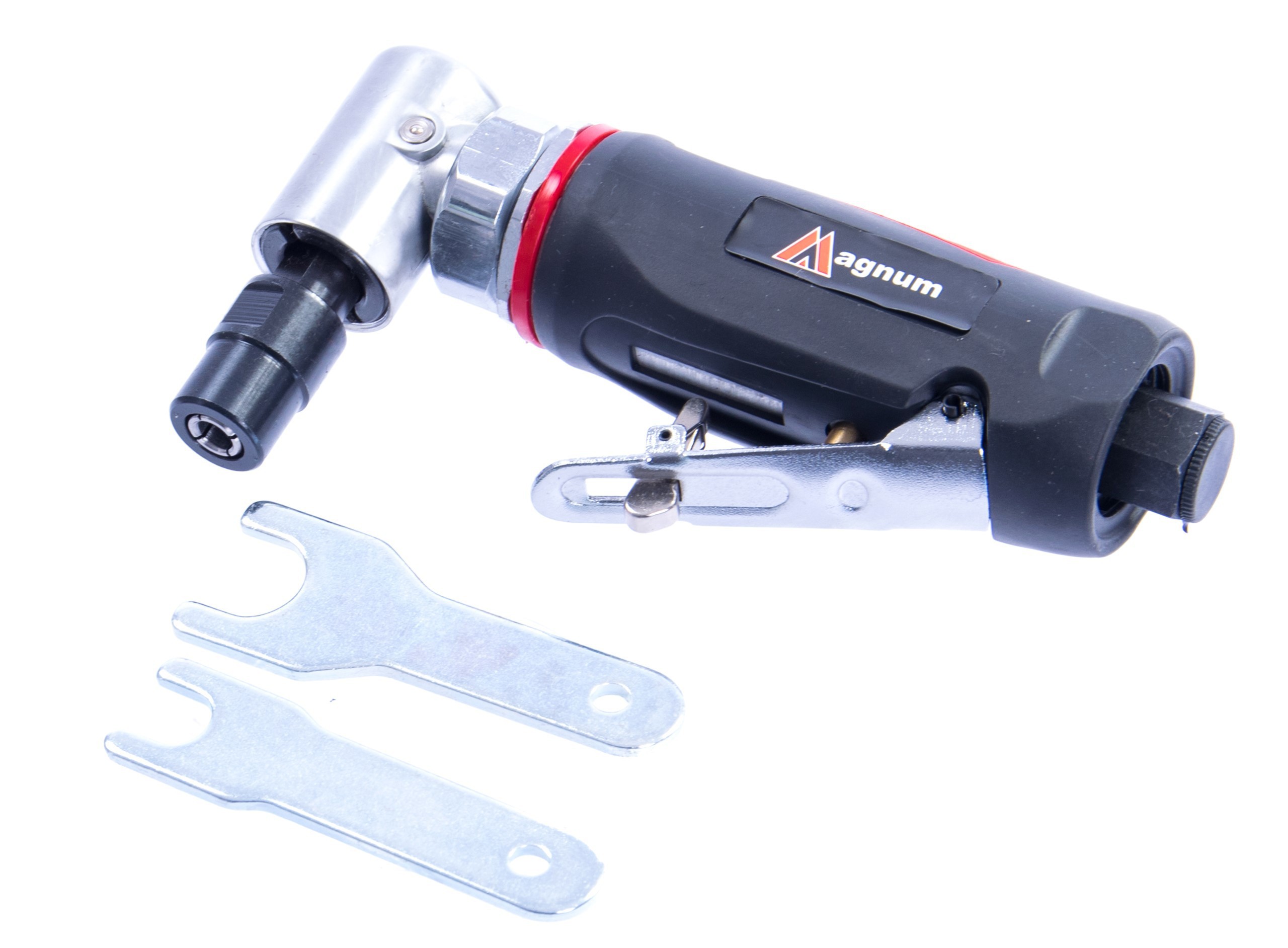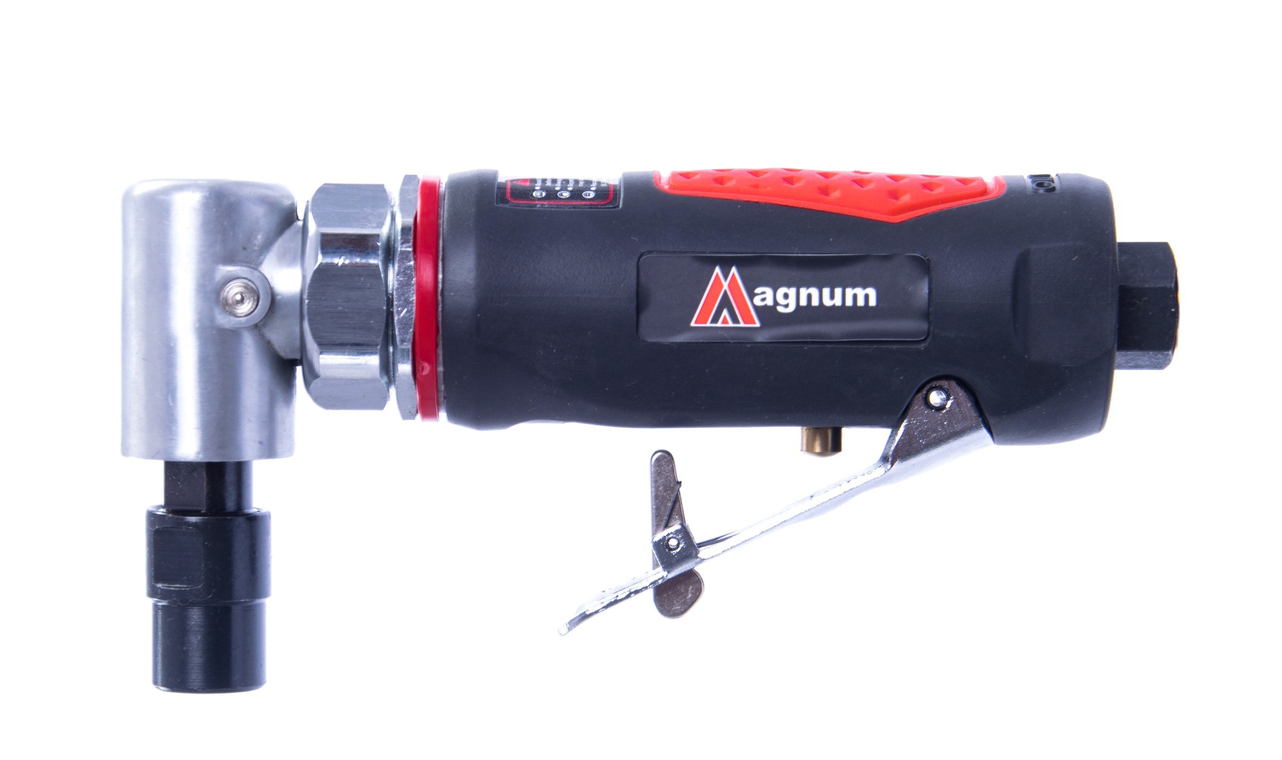 Szlifierka kątowa trzpieniowa marki MAGNUM. Niezastąpione narzędzie dla każdego spawacza, ślusarza, mechanika czy serwisanta. Może współpracować z kamieniami i frezami palcowymi (pilnikami) o średnicy 6 mm. Lekka i ergonomiczne wyprofilowana. Spust wyposażony w blokadę zabezpieczającą przed przypadkowym uruchomieniem.