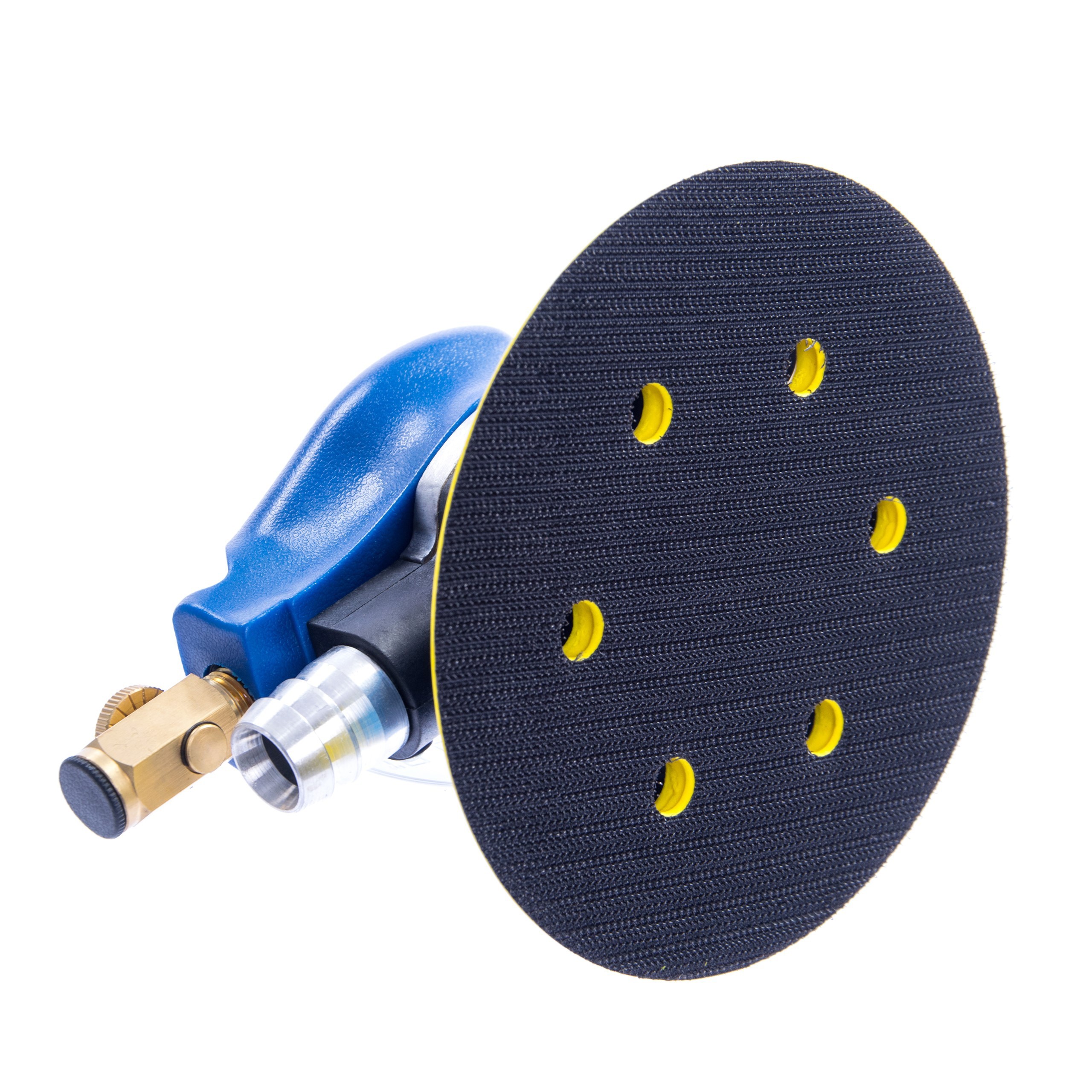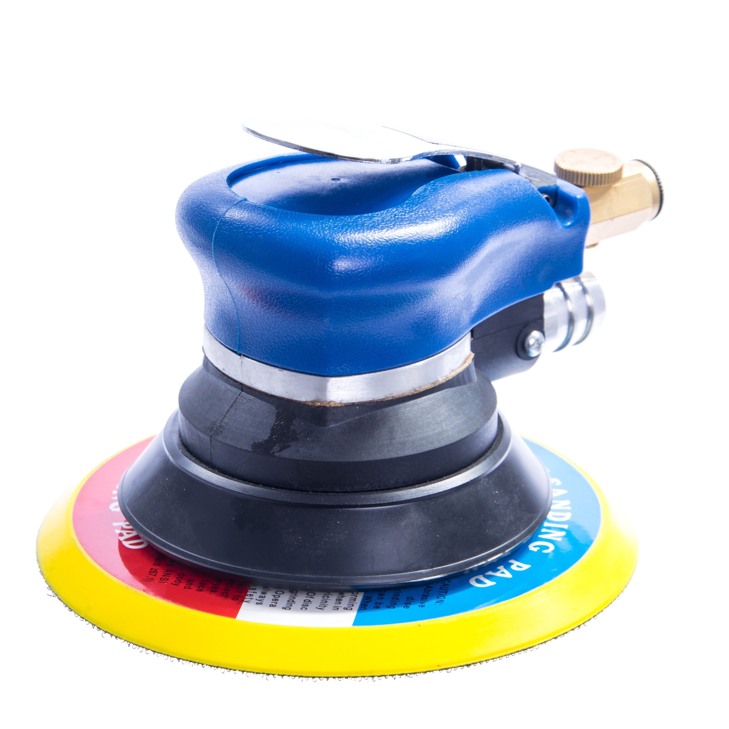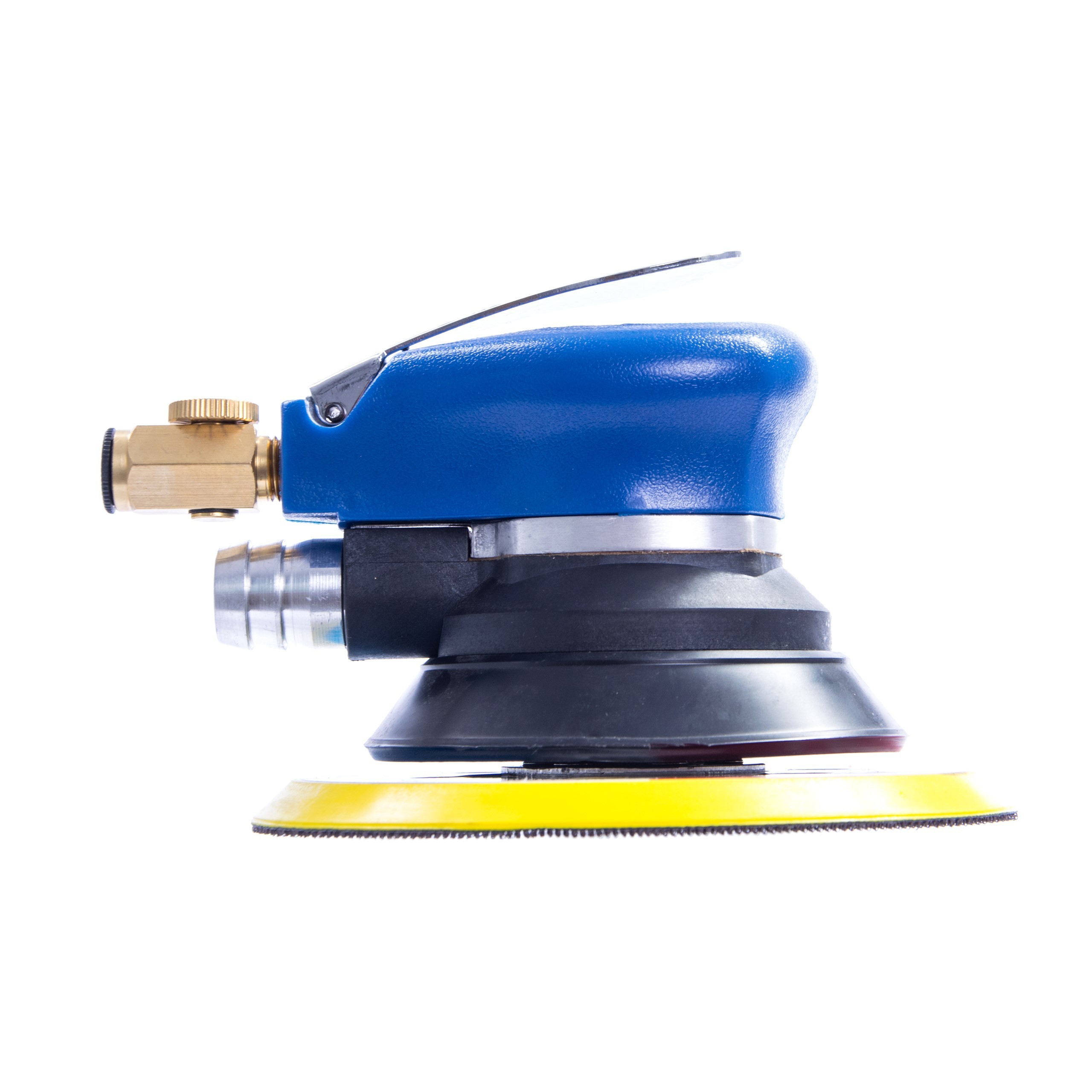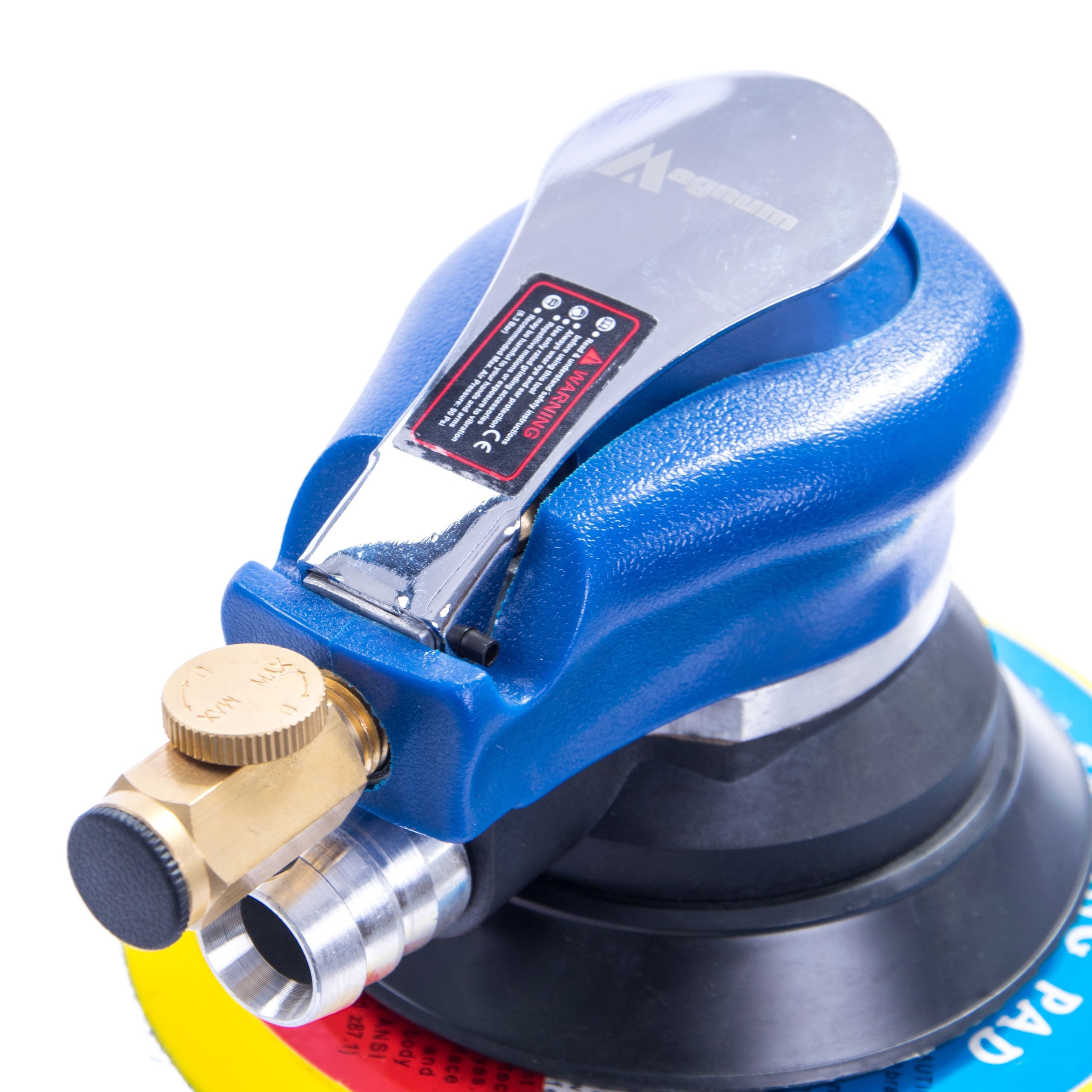 Pneumatyczna szlifierka marki MAGNUM. Szlifierka mimośrodowa znajduje zastosowanie zarówno w przemyśle jak i wszelkiego rodzaju warsztatach zajmujących się przygotowaniem powierzchni. Mimośrodowy ruch tarczy o skoku 5 mm gwarantuje równomierną i precyzyjną obróbkę powierzchni. Ergonomiczny kształt uchwytu oraz dźwigni włączającej zapewnia pełną swobodę operowania szlifierką. Tarcza posiada otwory które umożliwiają zastosowanie odciągu co wpływa na porządek podczas wykonywanej pracy.