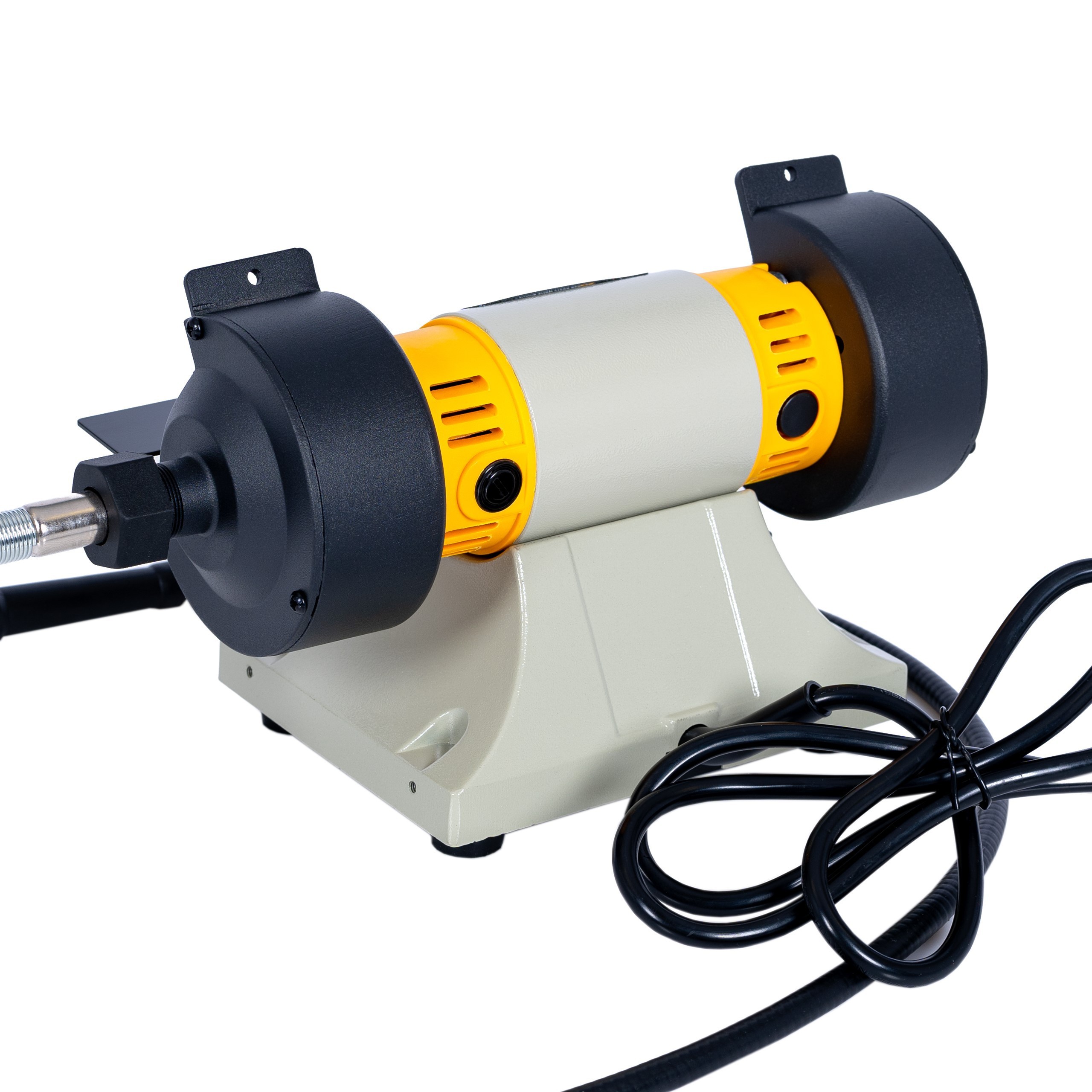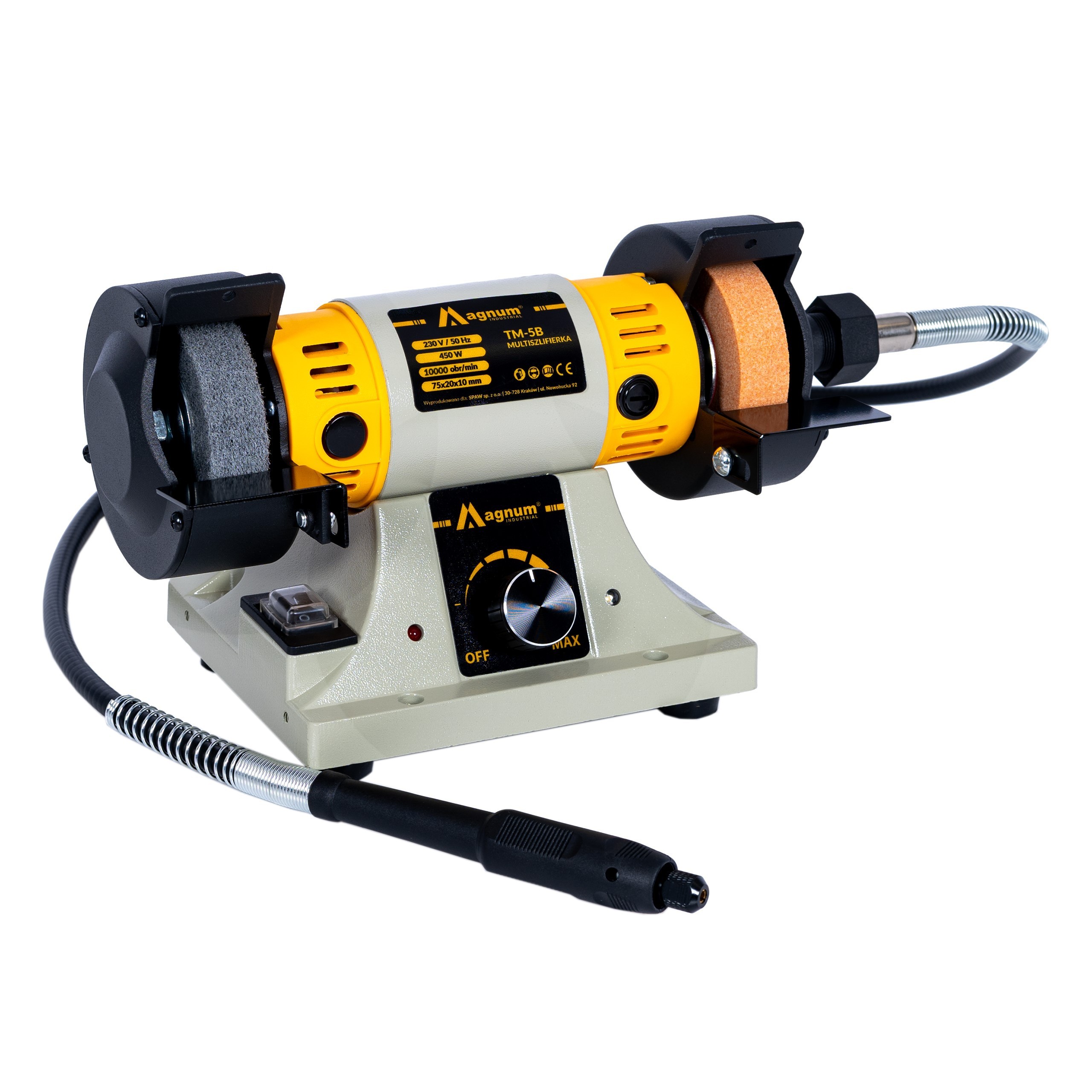 Szlifierko-polerka stołowa z wałkiem giętkim, na końcu którego znajduje się uchwyt mocujący. Silnik do pracy dorywczej w grupie natężenia S2-20 min. Wyposażona w dwie tarcze: kamień do szlifowania oraz filc do polerowania. Do uchwytu wiertarskiego możemy zamocować frezy palcowe, wiertła, kamienie itd. Płynna regulacja obrotów zwiększa funkcjonalność szlifierki, ponieważ możemy pracować w różnorodnych materiałach oraz narzędziami o zróżnicowanych średnicach. Dołączony uchwyt pozwala na mocowanie wierteł oraz frezów do średnicy 3 mm. Solidne wykonanie, oraz silnik o mocy 450 W pozwalają na bezpieczną i wygodną pracę z urządzeniem. Posiadamy w ofercie osprzęt oraz części zapasowe do sprzedawanej szlifierki.