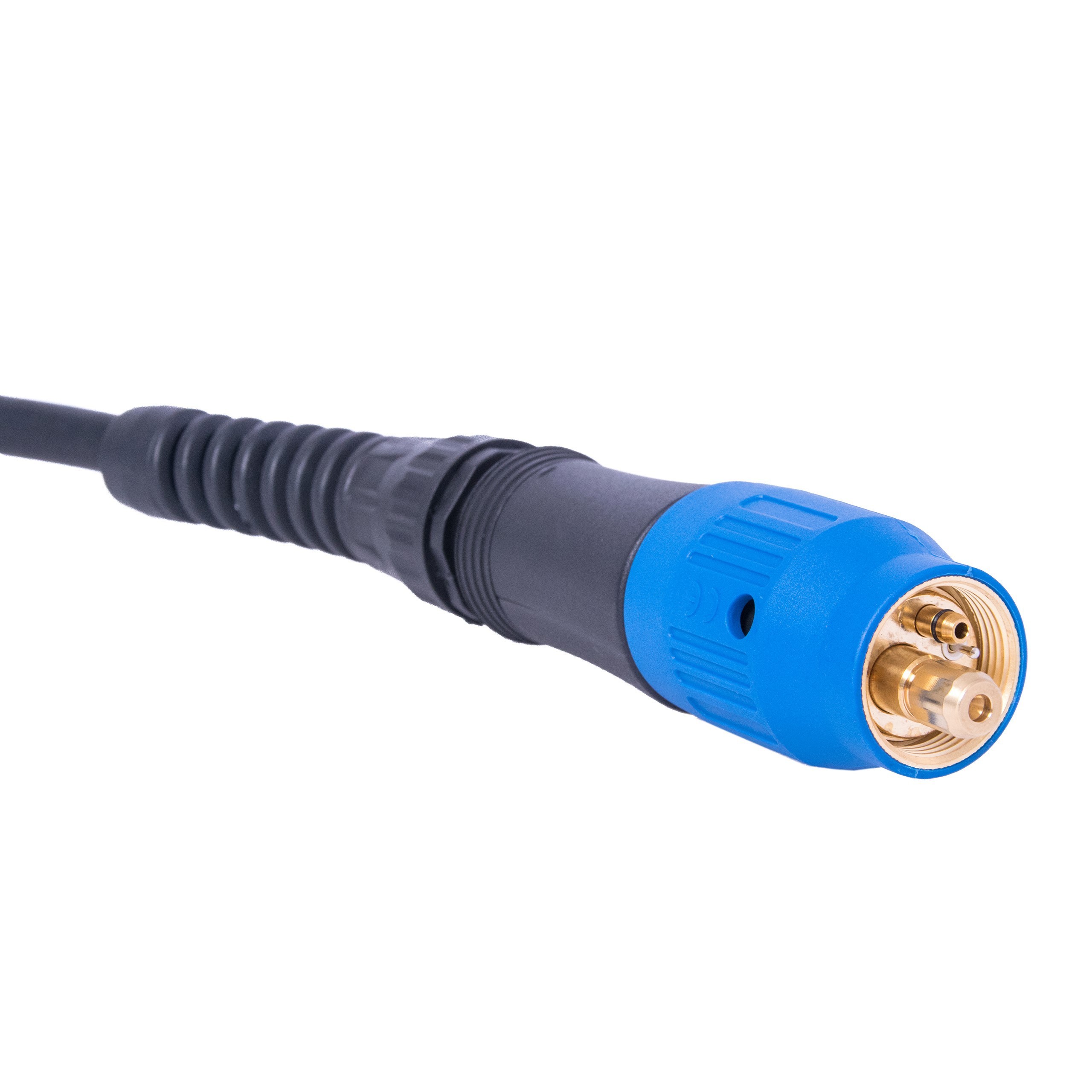 Uchwyt chłodzony jest gazem osłonowym, zakończony znormalizowanym przyłączem typu EURO, pasującym do większości półautomatów spawalniczych.