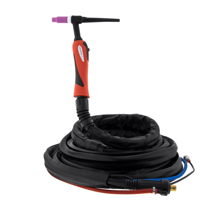 Uchwyt wyposażony jest w ergonomicznie ukształtowaną rękojeść. Dodatkowo tuż za rękojeścią uchwyt posiada oplot ze skóry (około 50 cm), który zapewnia dużą elastyczność i wygodę użytkowania. Przewody wykonane są z solidnych materiałów, co zapewnia wysoką odporność na przetarcia i uszkodzenia mechaniczne. Standardowe złącze wtyk 50 pasuje do większości spawarek TIG dostępnych na rynku.