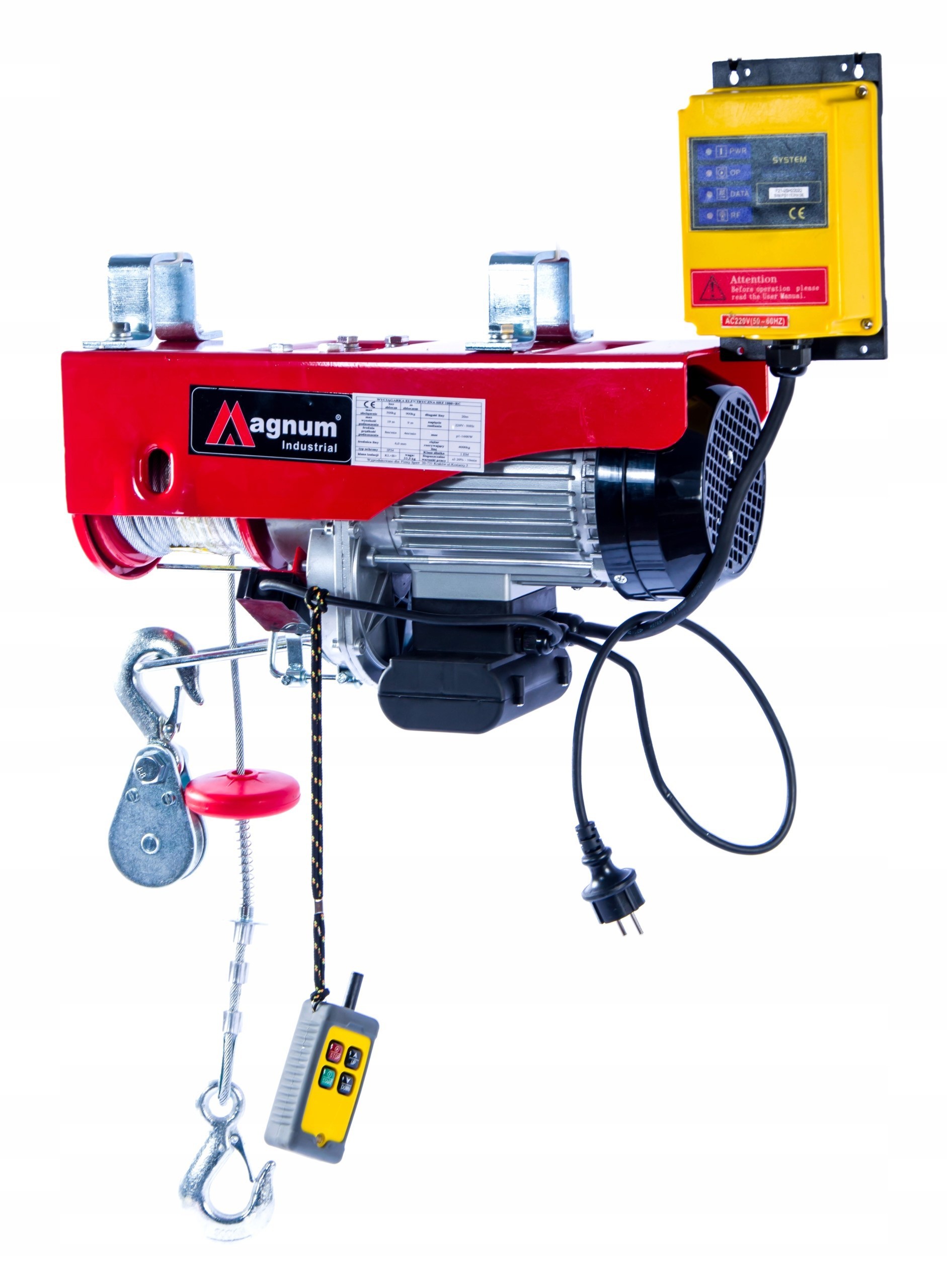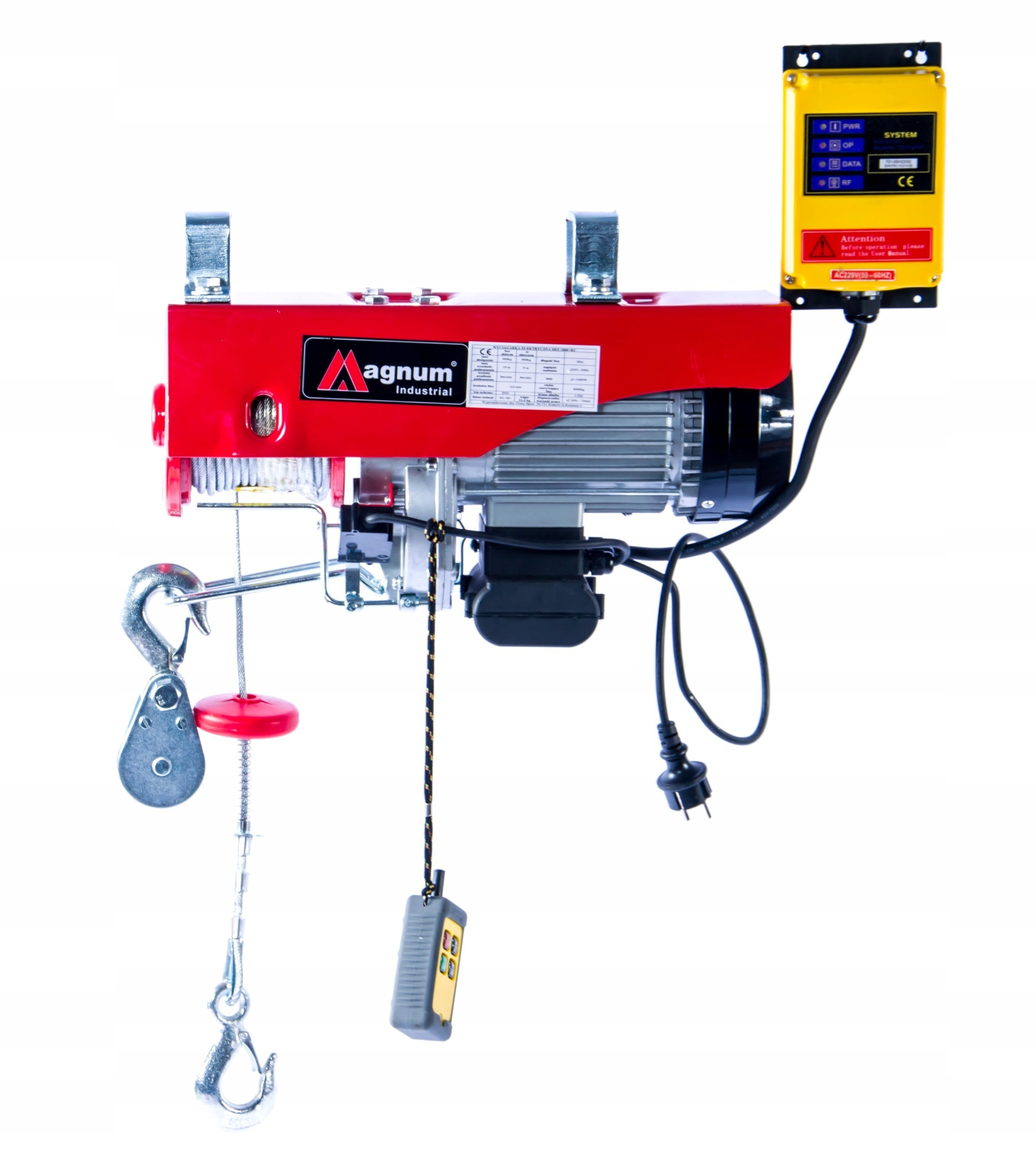 Zdalnie sterowana elektryczna wciągarka linowa marki MAGNUM. Wciągarka sterowana jest bezprzewodowo, dzięki czemu poprawiono wygodę oraz bezpieczeństwo operatora. Urządzenie wyposażone jest czujnik krańcowy zabezpieczający wciągarkę przed wciągnięciem ładunku w bęben. Wciągarka posiada również zabezpieczenie przed nadmiernym rozwinięciem liny i nawinięciem jej w złym kierunku. Nad bezpieczeństwem pracy czuwa zblocze z zabezpieczeniem oraz hamulec elektromagnetyczny. Ergonomiczny pilot dobrze leży w dłoni. W zestawie uchwyty montażowe.