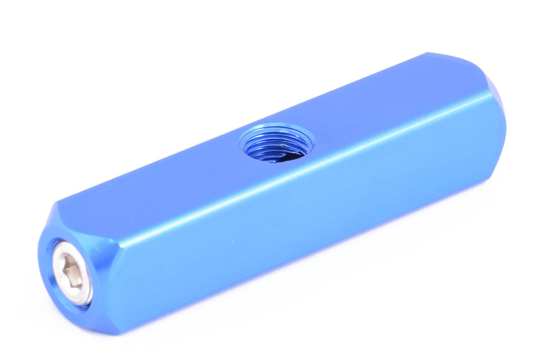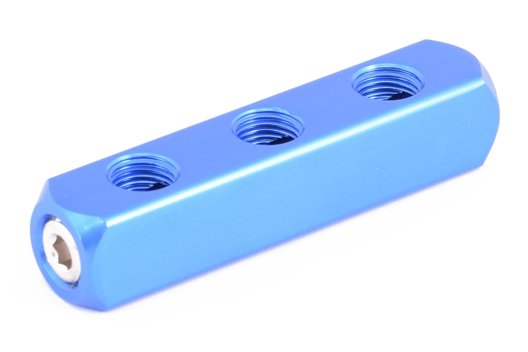 Listwa rozdzielająca do sprężonego powietrza lub wody wykonana z aluminium anodowanego na niebiesko. Łącznie posiada cztery przyłącza o gwincie calowym walcowym 1/4" (~13 mm).