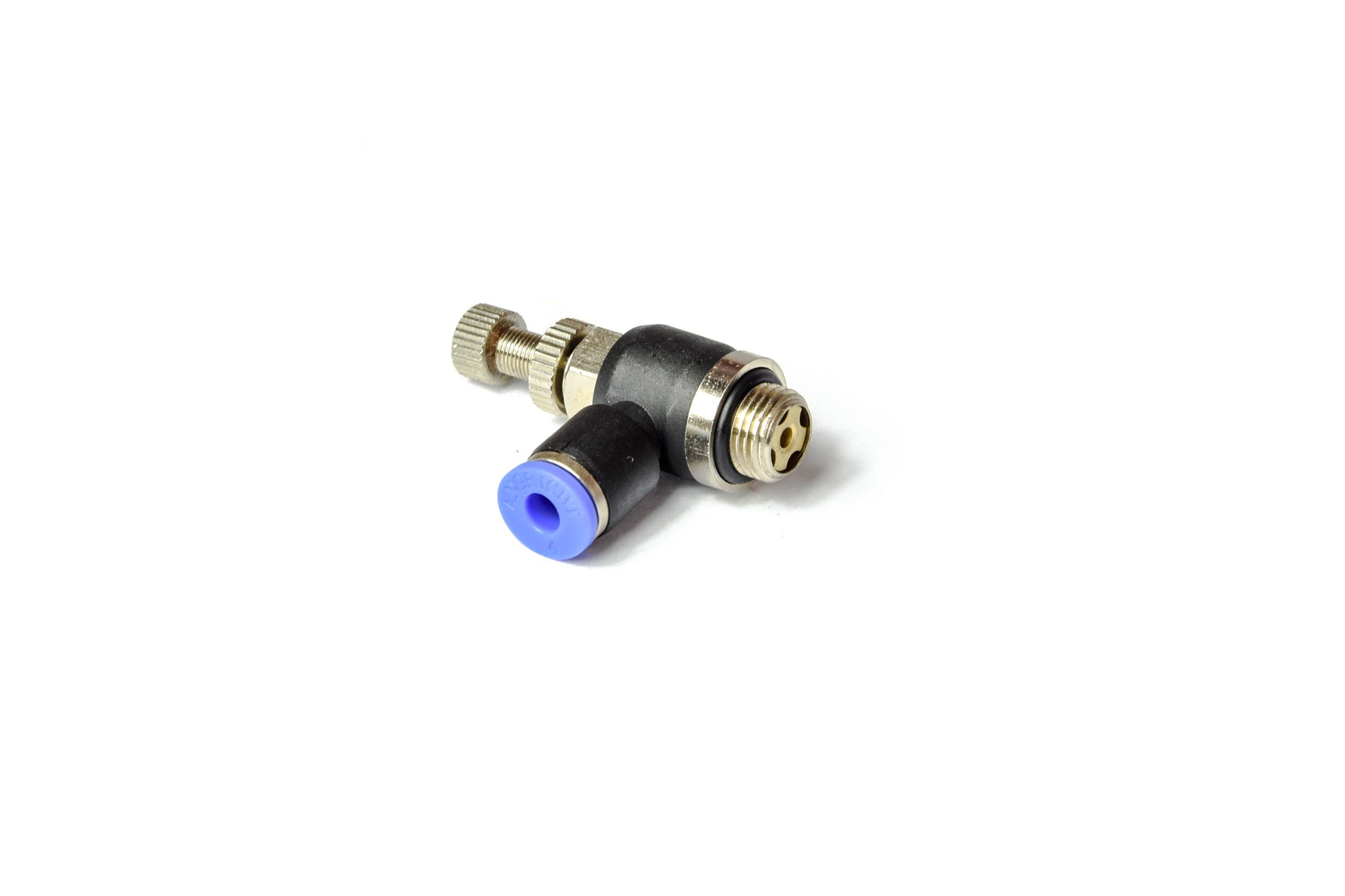 Kątowy zawór dławiąco zwrotny do instalacji pneumatycznych pozwala regulację przepływu czynnika roboczego w jednym kierunku. Połączenie pomiędzy częścią metalową, a korpusem z tworzywa pozwala na wykonanie obrotu w celu odpowiedniego ułożenia kierunku przewodu. Zawory tego typu służą do regulacji prędkości siłowników, ograniczania przepływu itp., nie służą do zamykania dopływu powietrza.