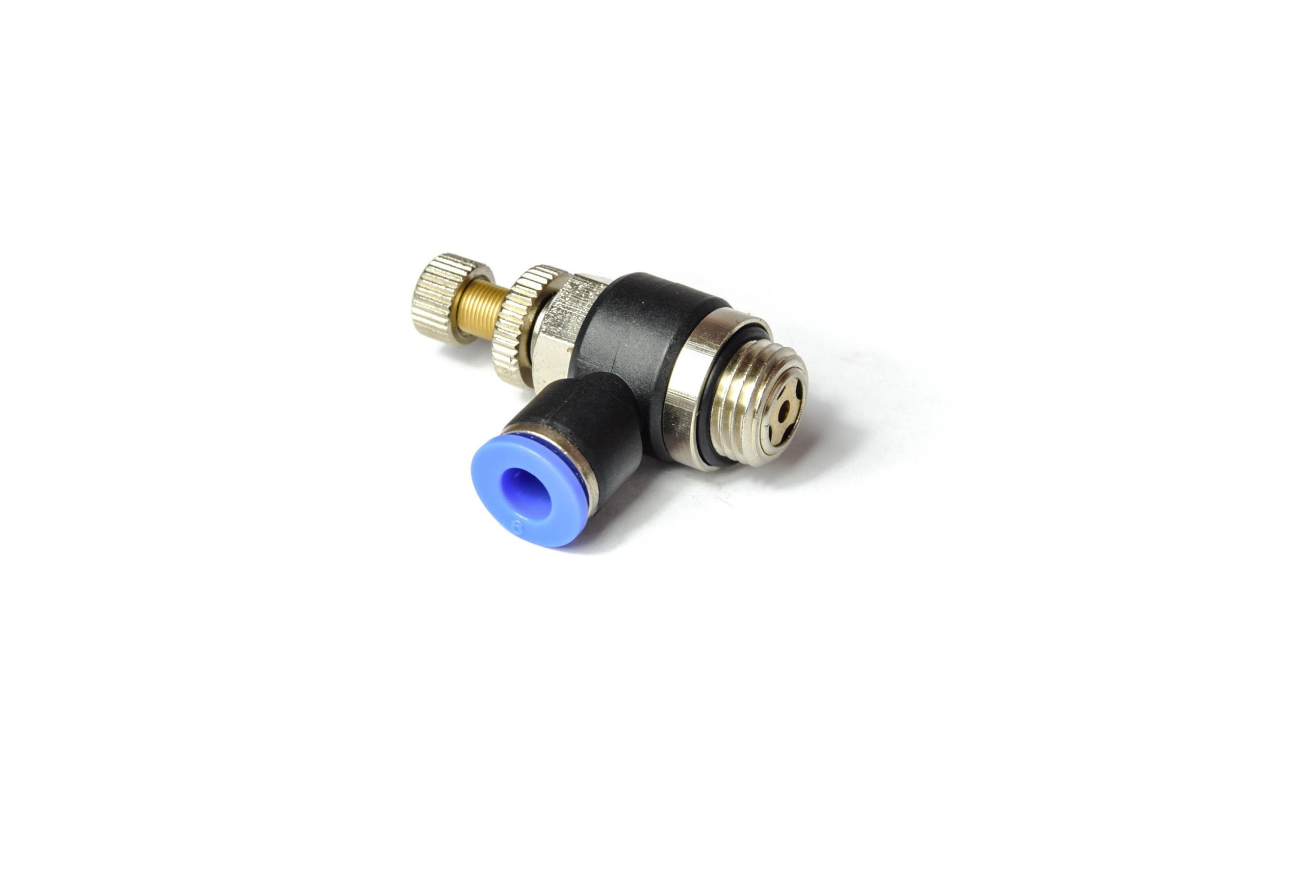 Kątowy zawór dławiąco zwrotny do instalacji pneumatycznych pozwala regulację przepływu czynnika roboczego w jednym kierunku. Połączenie pomiędzy częścią metalową, a korpusem z tworzywa pozwala na wykonanie obrotu w celu odpowiedniego ułożenia kierunku przewodu. Zawory tego typu służą do regulacji prędkości siłowników, ograniczania przepływu itp., nie służą do zamykania dopływu powietrza.