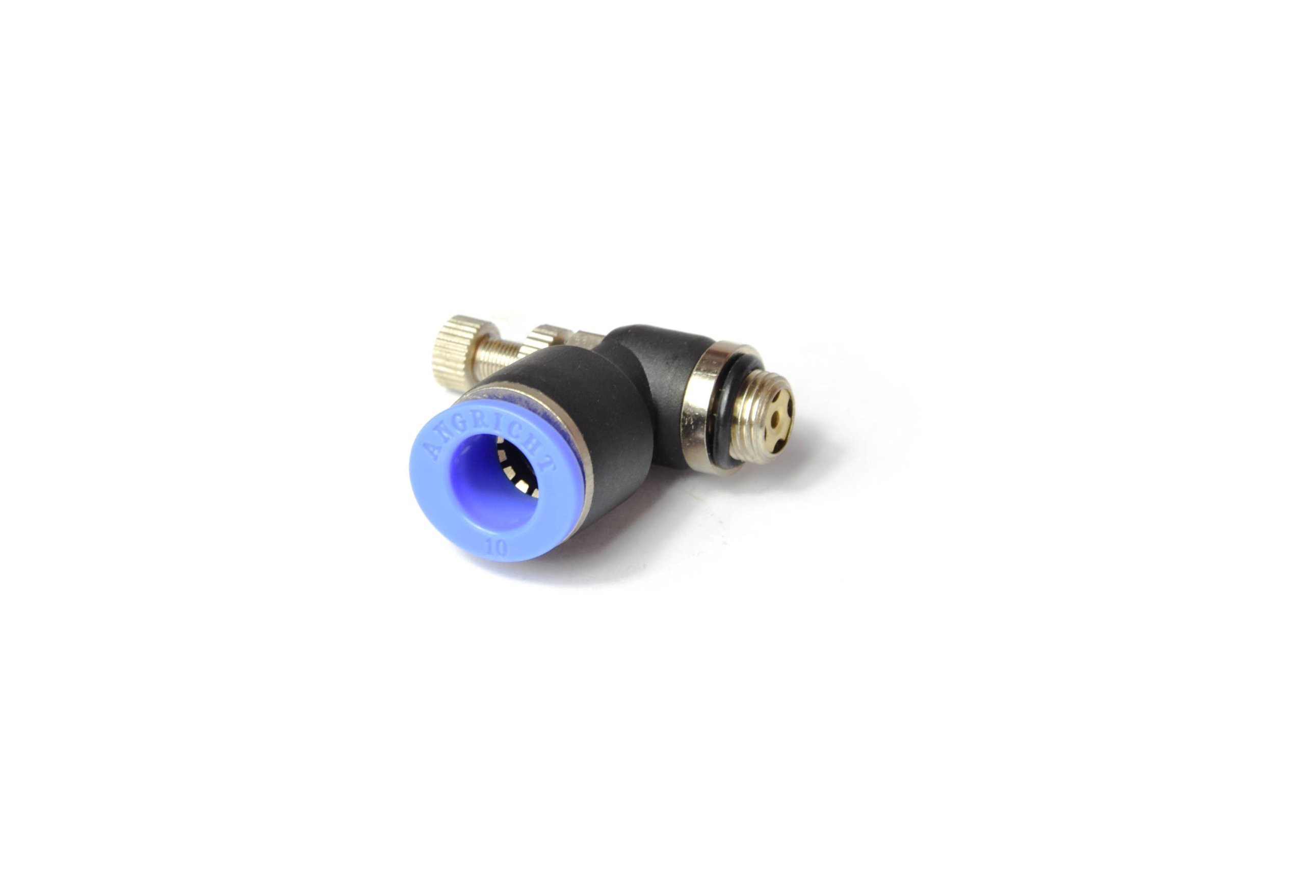 Kątowy zawór dławiąco zwrotny do instalacji pneumatycznych pozwala regulację przepływu czynnika roboczego w jednym kierunku. Połączenie pomiędzy częścią metalową, a korpusem z tworzywa pozwala na wykonanie obrotu w celu odpowiedniego ułożenia kierunku przewodu. Zawory tego typu służą do regulacji prędkości siłowników, ograniczania przepływu itp., nie służą do zamykania dopływu powietrza.