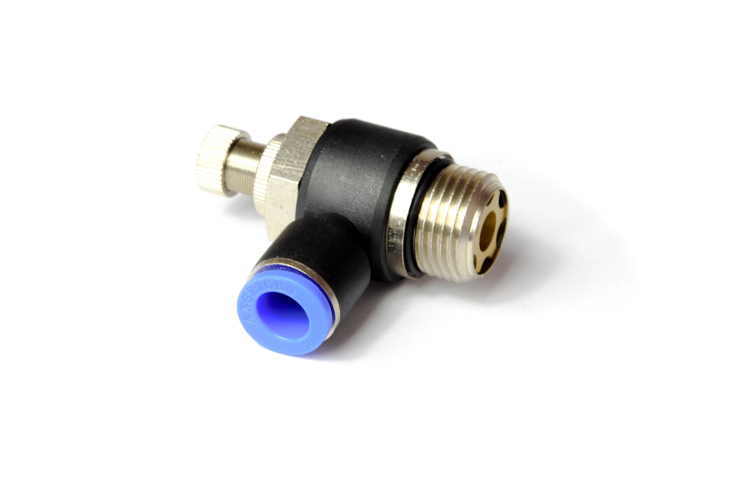Kątowy zawór dławiąco zwrotny do instalacji pneumatycznych pozwala regulację przepływu czynnika roboczego w jednym kierunku. Połączenie pomiędzy częścią metalową, a korpusem z tworzywa pozwala na wykonanie obrotu w celu odpowiedniego ułożenia kierunku przewodu. Zawory tego typu służą do regulacji prędkości siłowników, ograniczania przepływu itp., nie służą do zamykania dopływu powietrza.