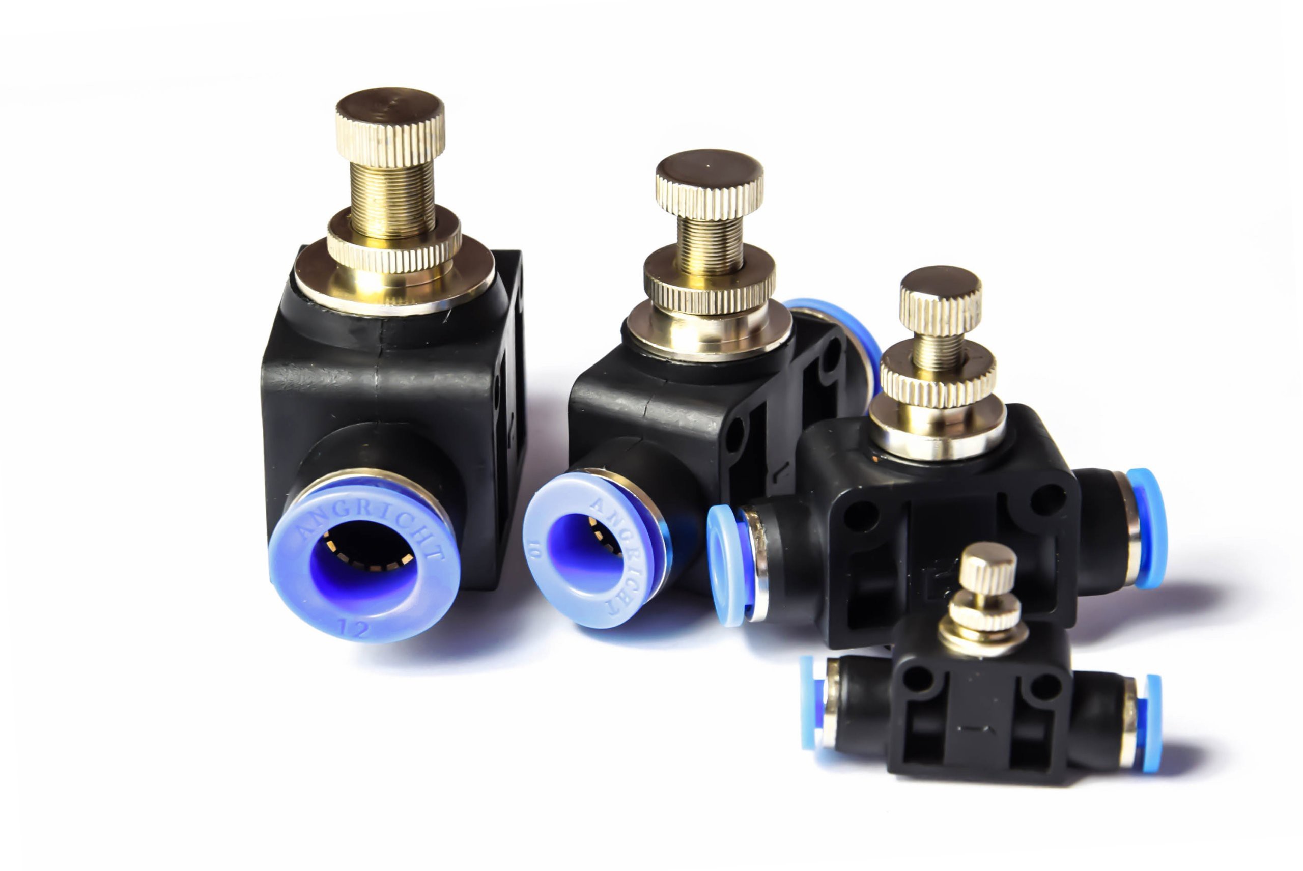 Zawór dławiąco zwrotny do instalacji pneumatycznych pozwala regulację przepływu czynnika roboczego w jednym kierunku. Zawory tego typu służą do regulacji prędkości siłowników, ograniczania przepływu itp., nie służą do zamykania dopływu powietrza.