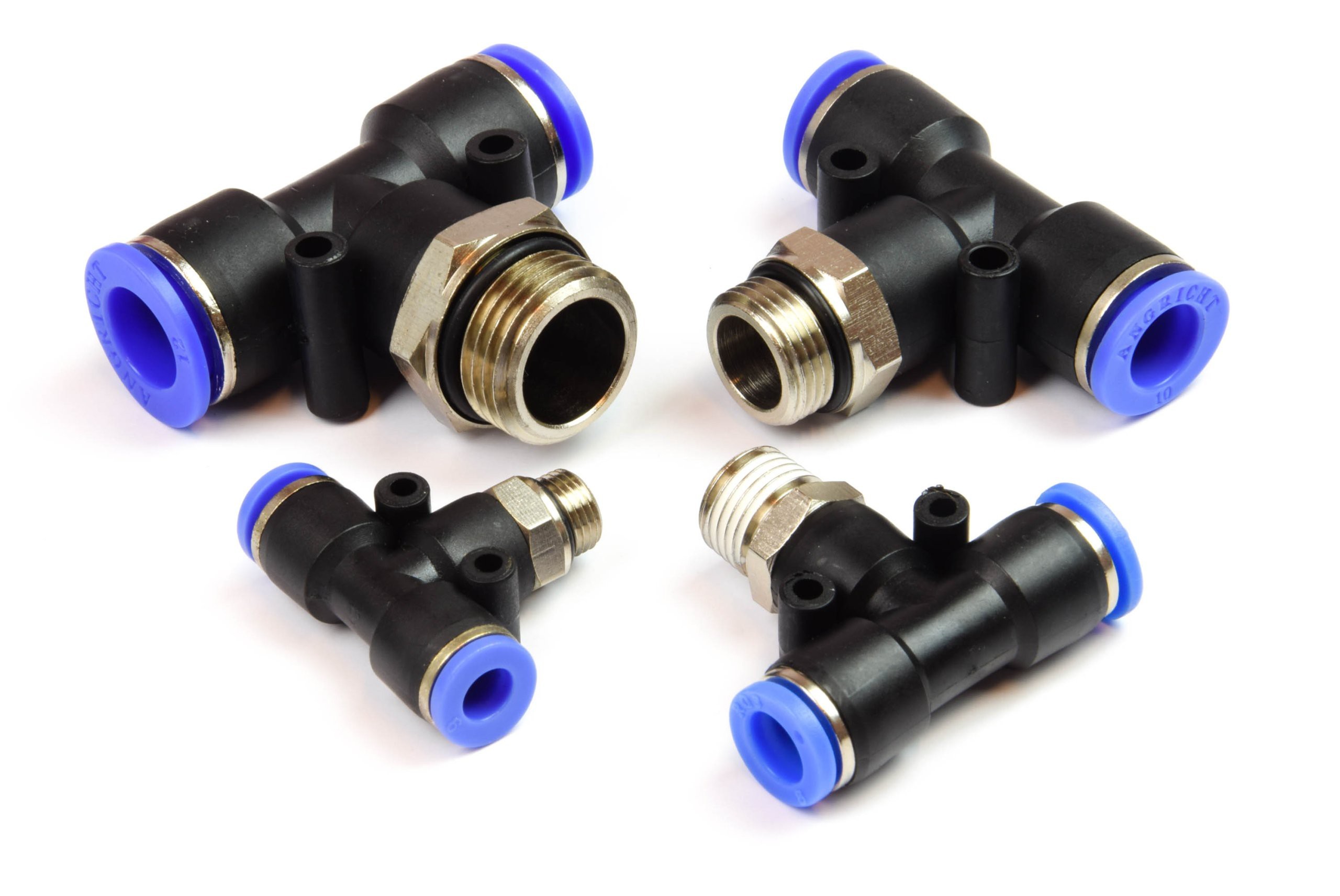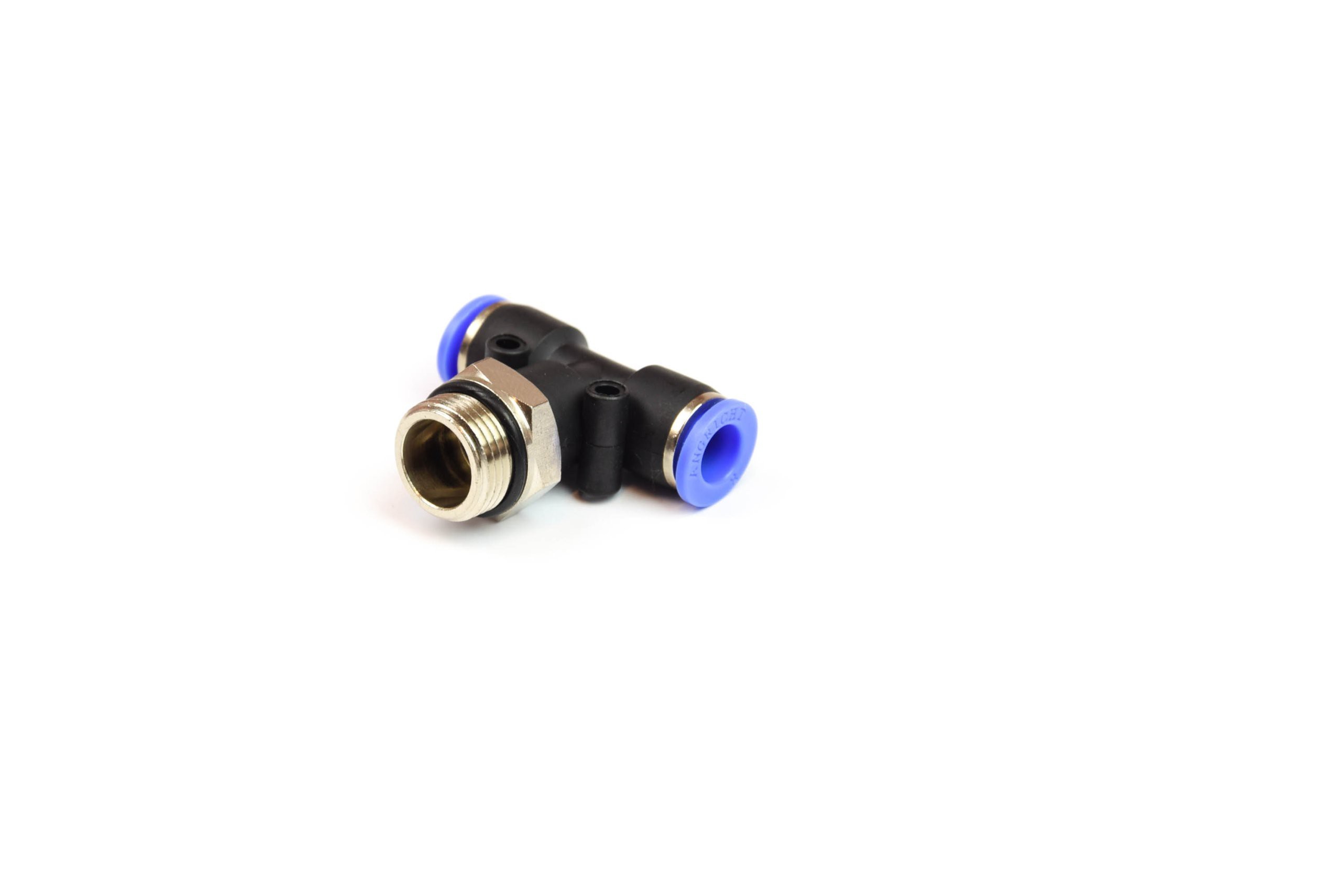 Złączka wtykowa trójnik obrotowy typu T do instalacji pneumatycznych pozwala na proste i szybkie łączenie elementów instalacji pneumatycznych. Połączenie pomiędzy częścią metalową, a korpusem z tworzywa pozwala na wykonanie obrotu w celu odpowiedniego ułożenia kierunku przewodu.