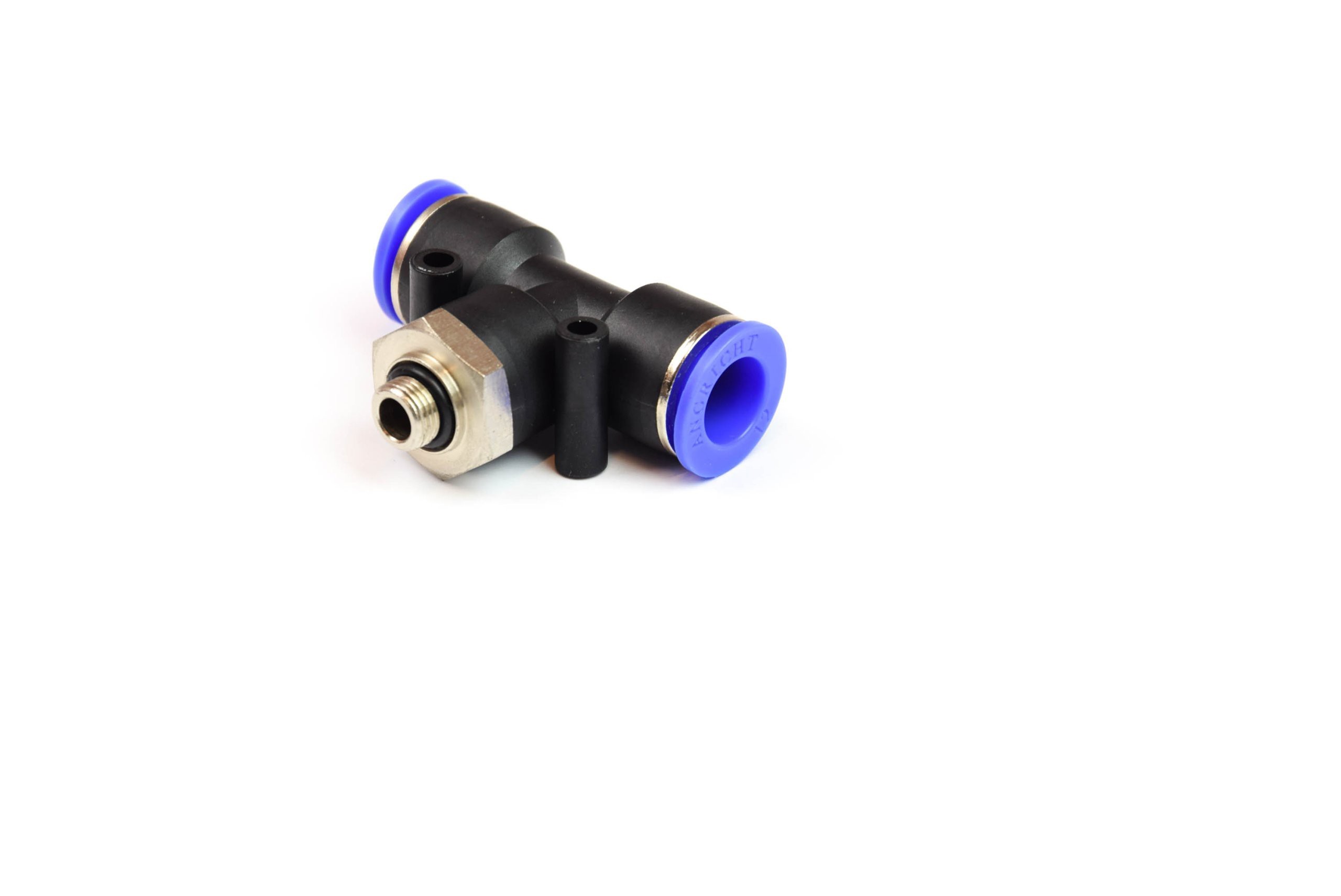Złączka wtykowa trójnik obrotowy typu T do instalacji pneumatycznych pozwala na proste i szybkie łączenie elementów instalacji pneumatycznych. Połączenie pomiędzy częścią metalową, a korpusem z tworzywa pozwala na wykonanie obrotu w celu odpowiedniego ułożenia kierunku przewodu.