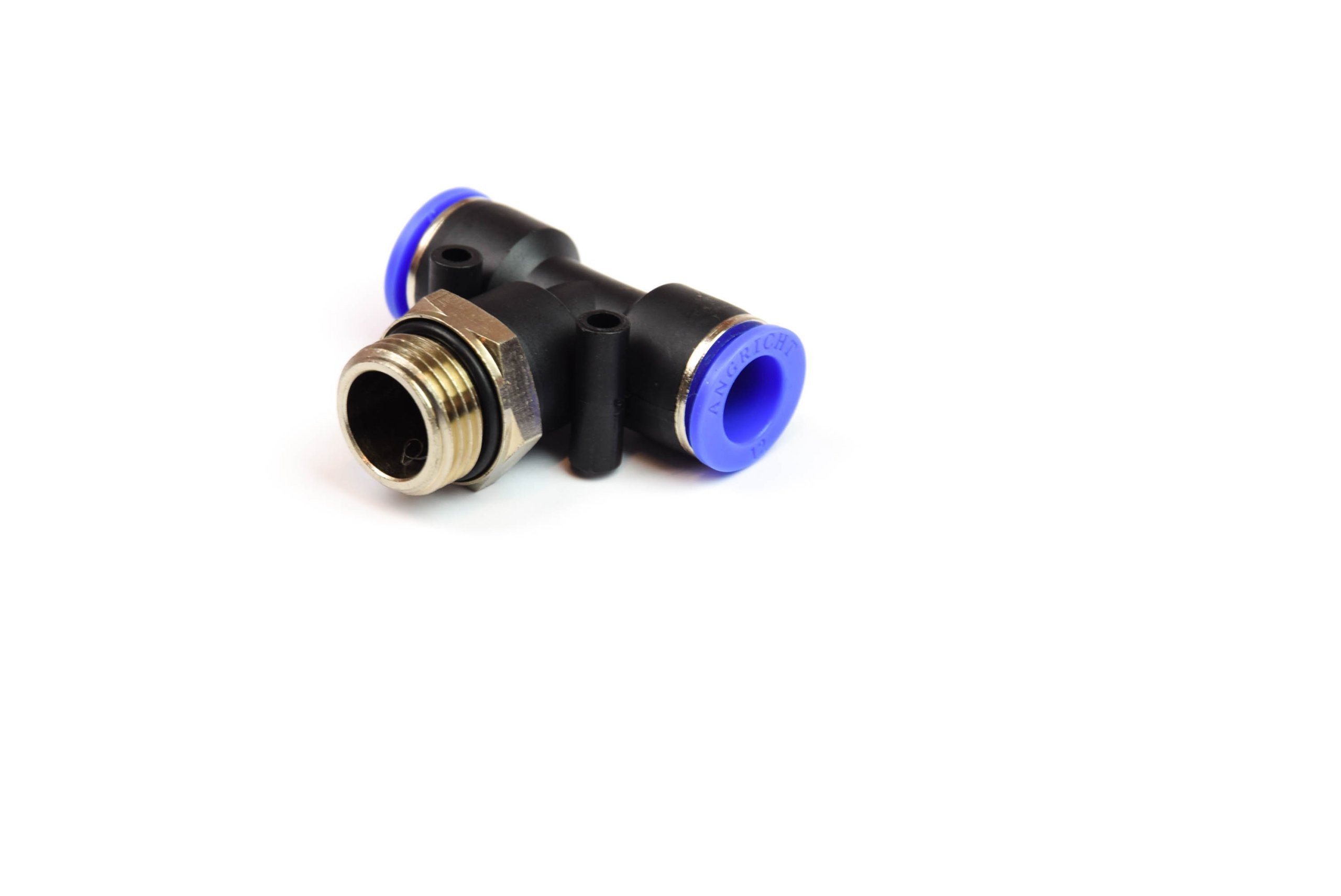 Złączka wtykowa trójnik obrotowy typu T do instalacji pneumatycznych pozwala na proste i szybkie łączenie elementów instalacji pneumatycznych. Połączenie pomiędzy częścią metalową, a korpusem z tworzywa pozwala na wykonanie obrotu w celu odpowiedniego ułożenia kierunku przewodu.