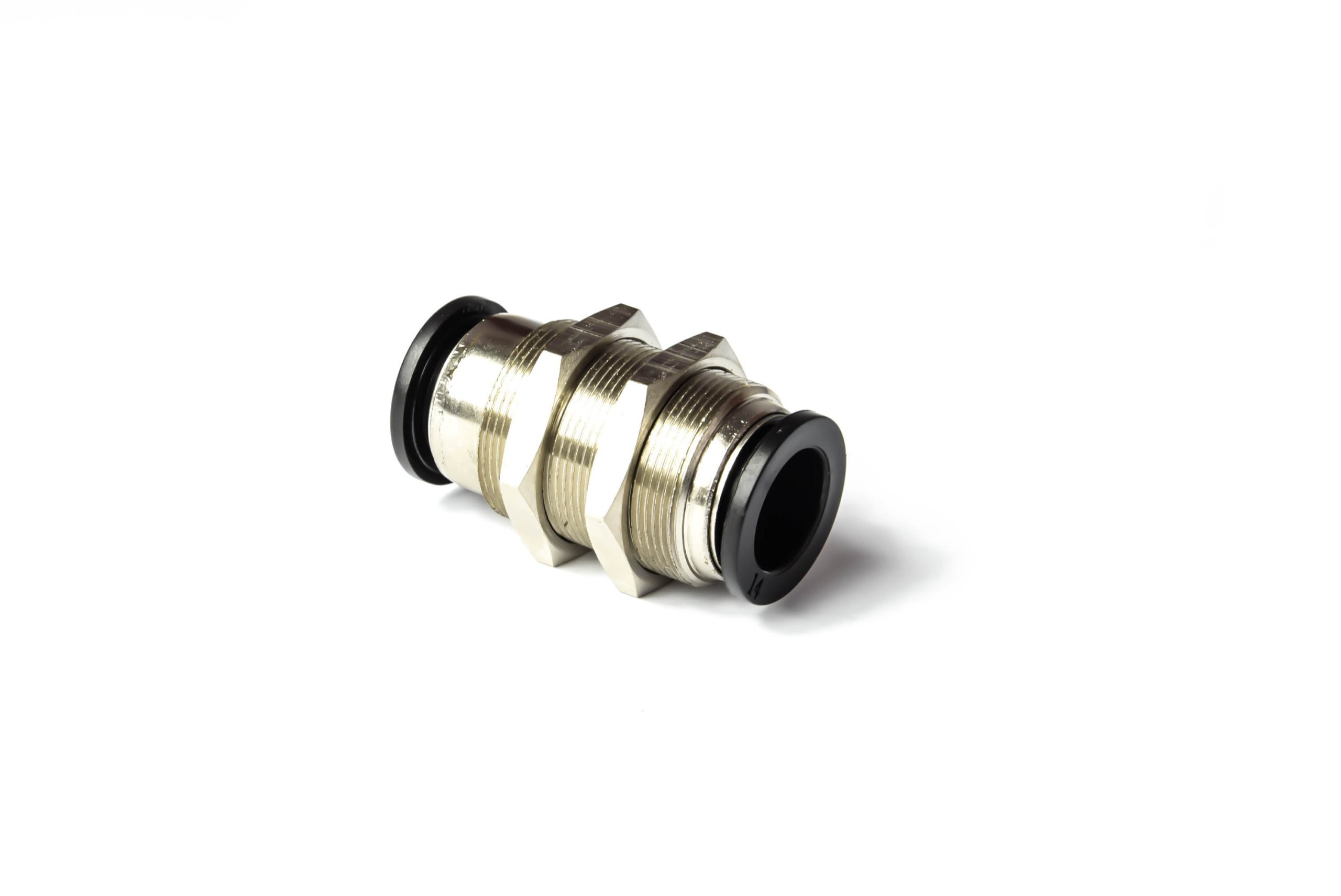 Złączka wtykowa, grodziowa typu łącznik przelotowy do instalacji pneumatycznych pozwala na proste i szybkie łączenie przewodów pneumatycznych. Złączka tego typu pozwala na łączenie przewodów i rurek po dwóch stronach ścianki, blachy itp. W zestawie nakrętki mocujące.
